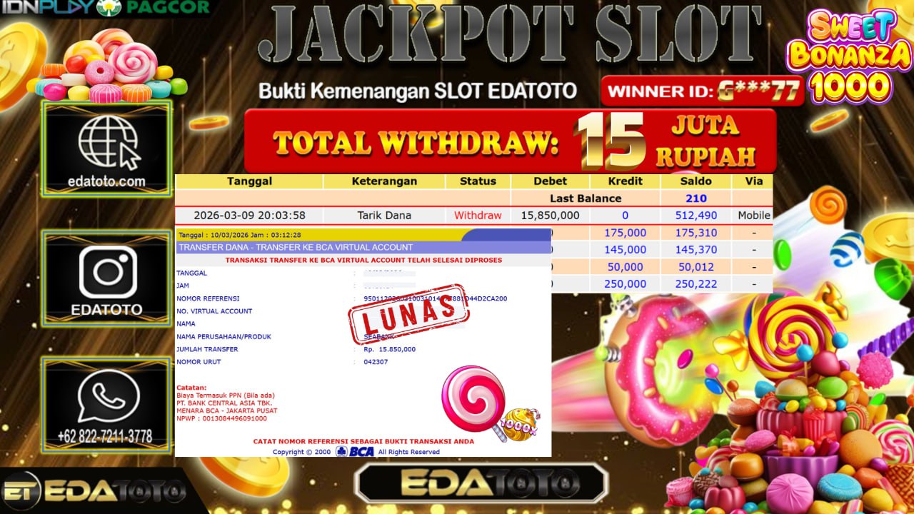 Selamat Kepada Pemilik user ID :g***77 Hari/Tanggal : Senin/ 09 MARET 2026 Jackpot : Rp, 15.153.000 JT Withdraw : 15,850,000 . . .