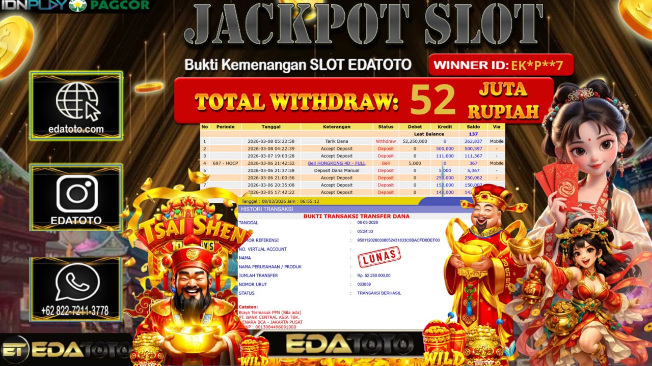Selamat Kepada Pemilik user ID :Ek*p**7 Hari/Tanggal : Minggu / 08 MARET 2026 Jackpot : Rp, 54.780.050 JT Withdraw : . . .