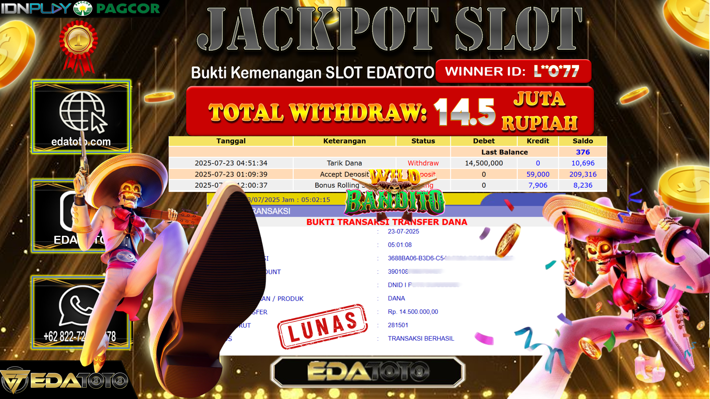 Selamat Kepada Pemilik user ID : L**O*77 Hari/Tanggal : Rabu/ 23, Juli 2025 Jackpot : Rp. 14.500.000 JT Permainan : Wild . . .