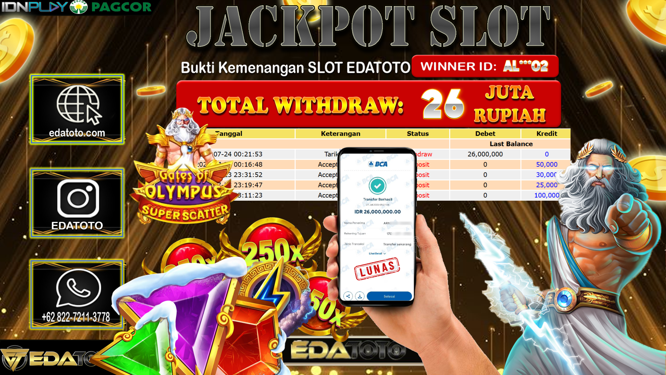 Selamat Kepada Pemilik user ID : AL***02 Hari/Tanggal : Kamis/ 24, Juli 2025 Jackpot : Rp. 26.000.000 JT Permainan : Gates . . .