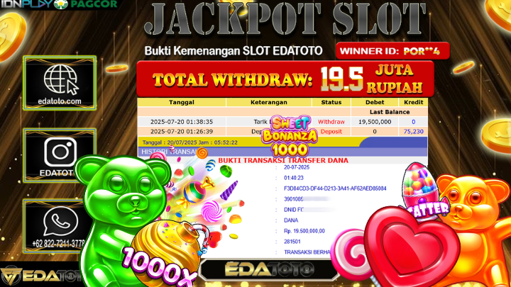 Selamat Kepada Pemilik user ID : POR**4 Hari/Tanggal : Minggu/ 20, Juli 2025 Jackpot : Rp. 19.500.000 JT Permainan : Sweet . . .