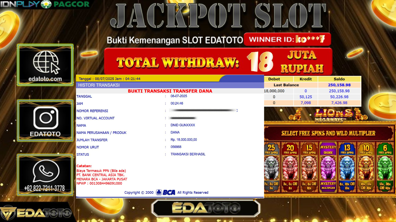 Selamat Kepada Pemilik user ID : N**V*LS2 Hari/Tanggal : Rabu/ 16, Juli 2025 Jackpot : Rp. 18.990.000 JT Permainan : Gates . . .