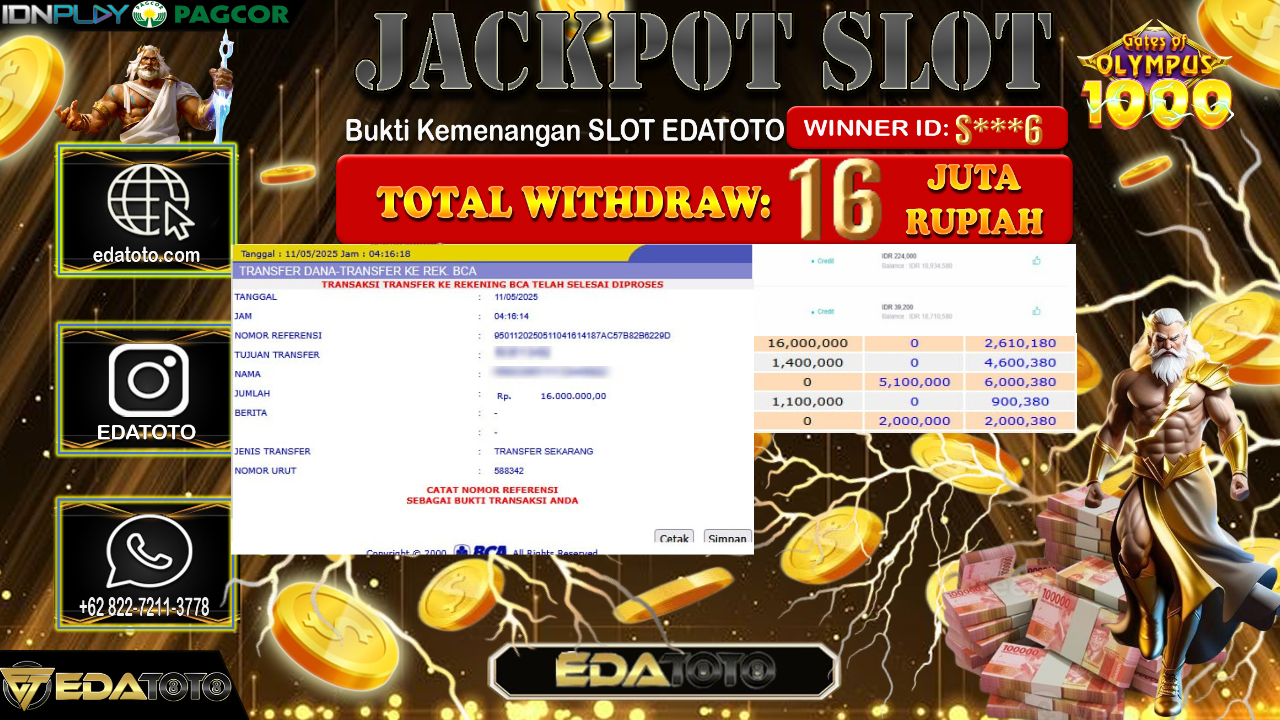 Selamat Kepada Pemilik user ID : S***6 Hari/Tanggal : Senin/ 12, Mei 2025 Jackpot : Rp. 16.000.000 JT Permainan : Gates . . .