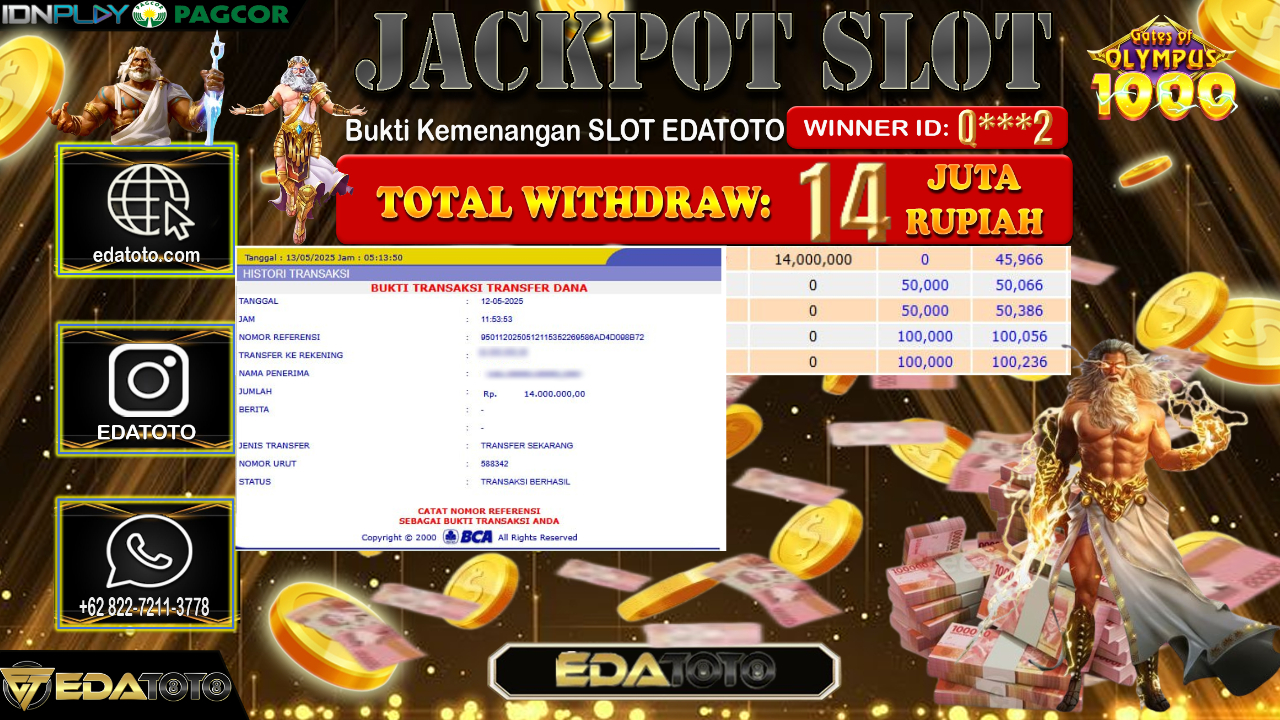 Selamat Kepada Pemilik user ID : Q***2 Hari/Tanggal : Selasa/ 13, Mei 2025 Jackpot : Rp. 14.000.000 JT Permainan : . . .