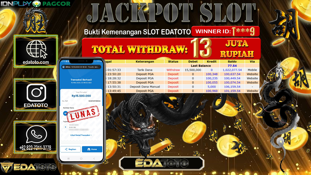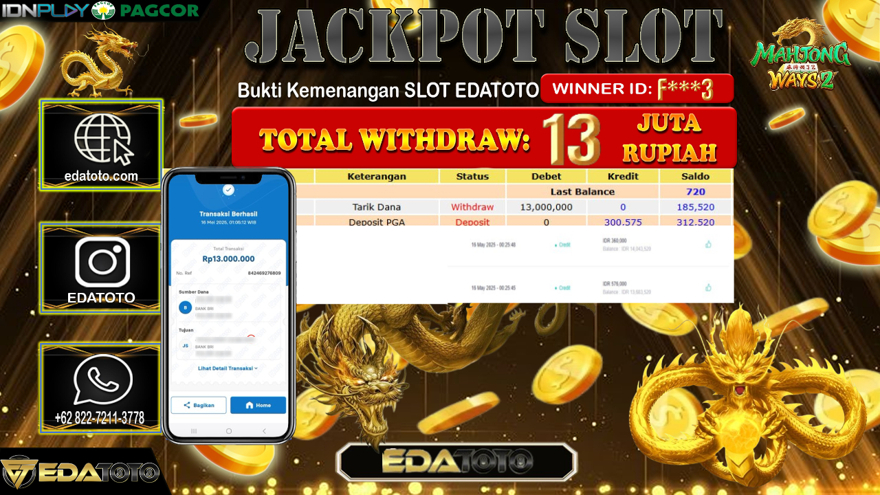 Selamat Kepada Pemilik user ID : T***9 Hari/Tanggal : Kamis/ 15, Mei 2025 Jackpot : Rp. 13.000.000 JT Permainan : Mahjong . . .