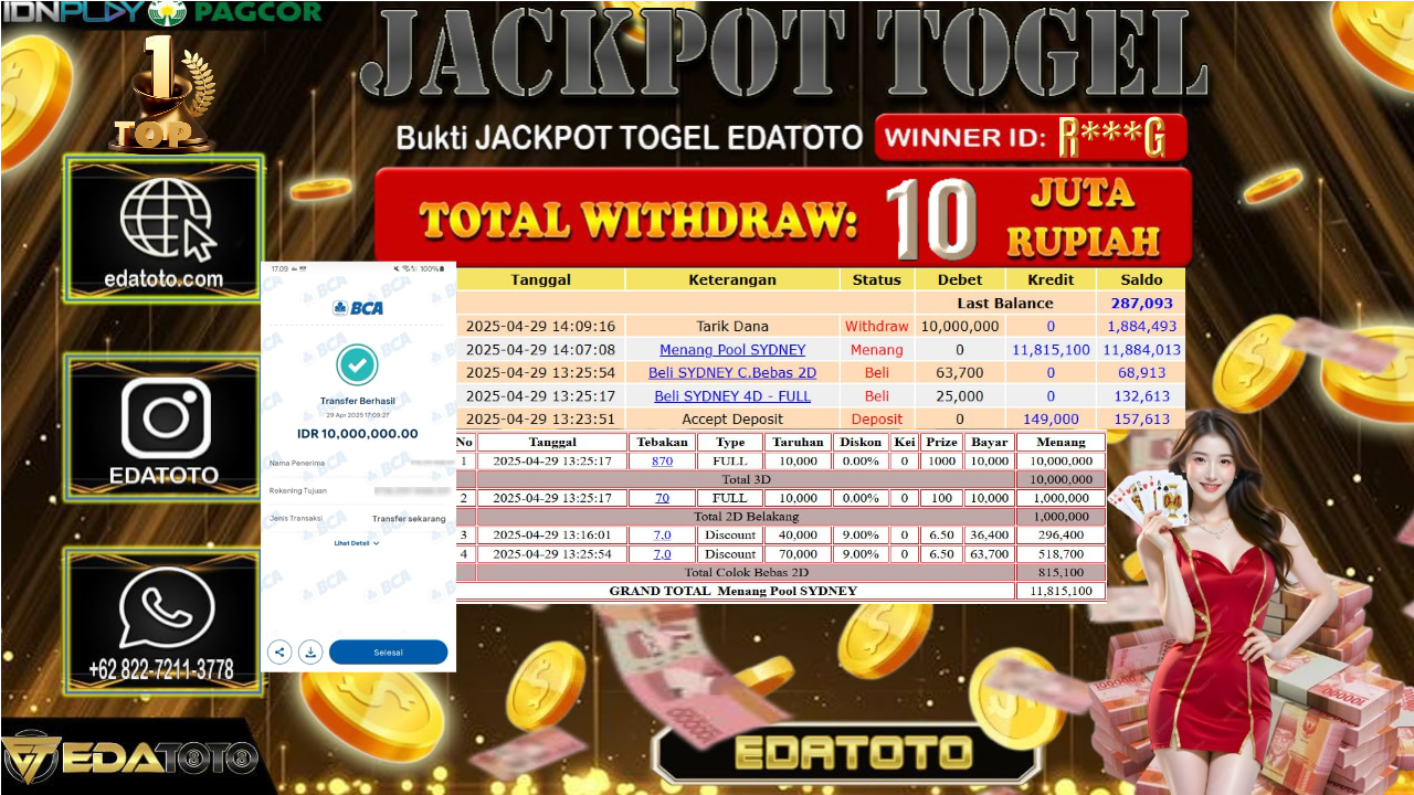 Selamat Kepada Pemilik user ID : R***G Hari/Tanggal : RABU/ 30 April 2025 Jackpot : Rp. 10.000.000 JT Permainan : TOGEL Selamat . . .
