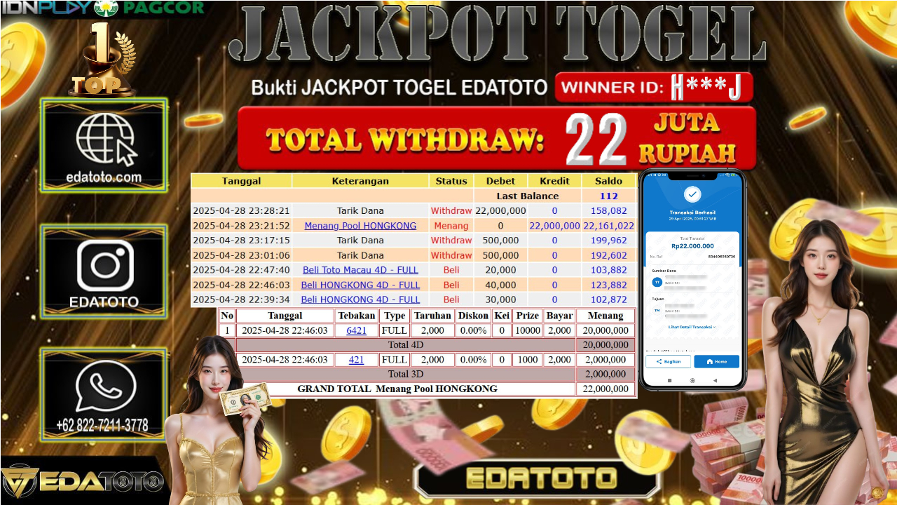 Selamat Kepada Pemilik user ID : H***J Hari/Tanggal : Selasa/ 29, April 2025 Jackpot : Rp. 20.000.000 JT Permainan : TOGEL . . .