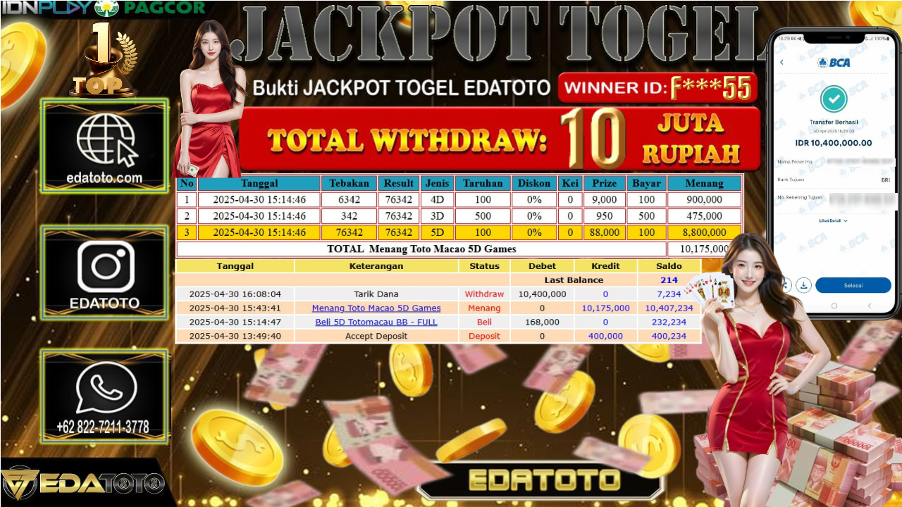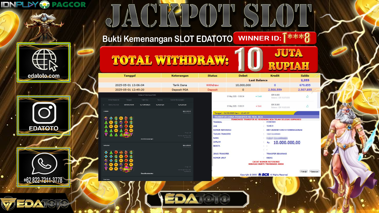 Selamat Kepada Pemilik user ID : T***8 Hari/Tanggal : Jum’at / 01, Mei 2025 Jackpot : Rp. 10.000.000 JT . . .