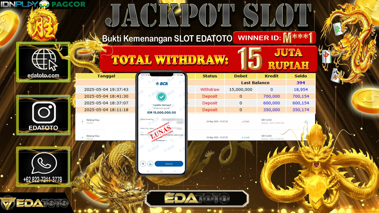 Selamat Kepada Pemilik user ID : M***1 Hari/Tanggal : Senin/ 05, Mei 2025 Jackpot : Rp. 15.000.000 JT Permainan : Mahjong . . .