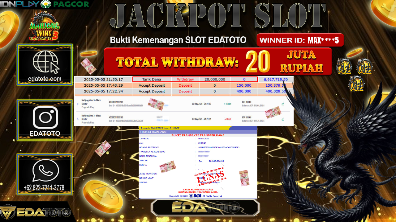 Selamat Kepada Pemilik user ID : MAX****5 Hari/Tanggal : Selasa/ 06, Mei 2025 Jackpot : Rp. 20.000.000 JT Permainan : MAHJONG . . .