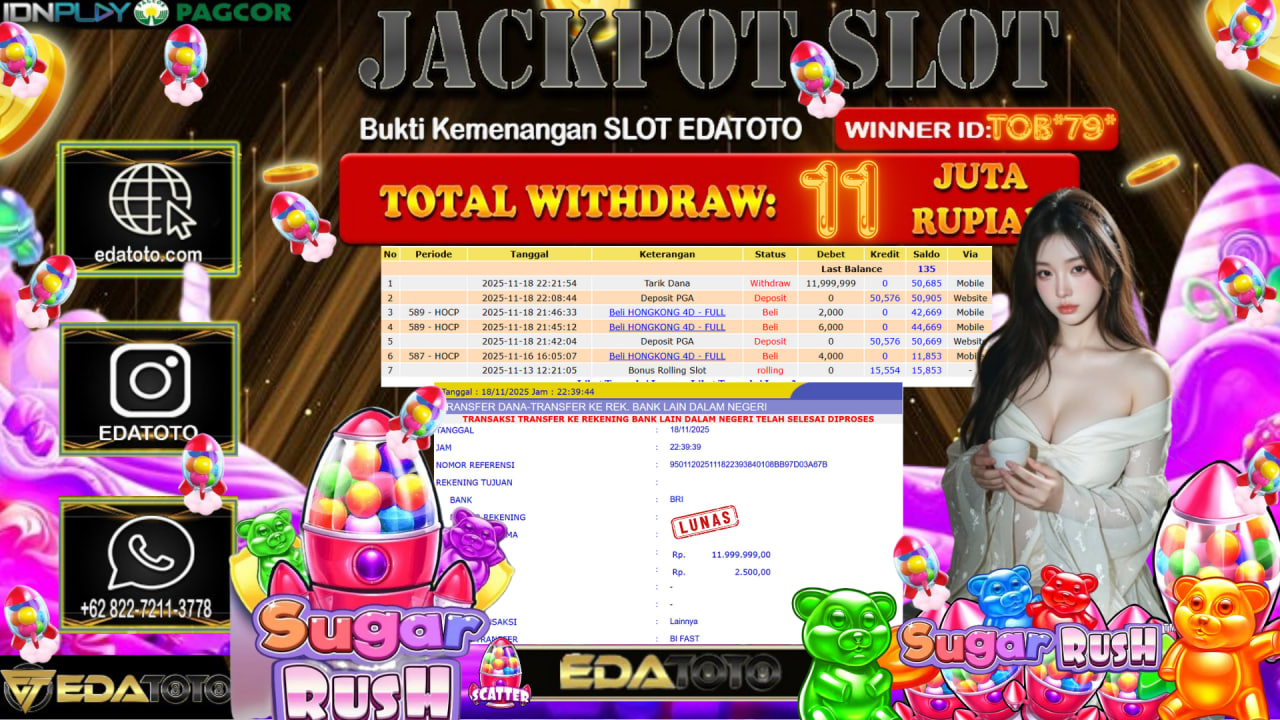 Selamat Kepada Pemilik user ID : KEL*86* Hari/Tanggal :Selasa / 18, November 2025 Jackpot : Rp. 11,200,000 JT Withdraw :10,000,000 . . .