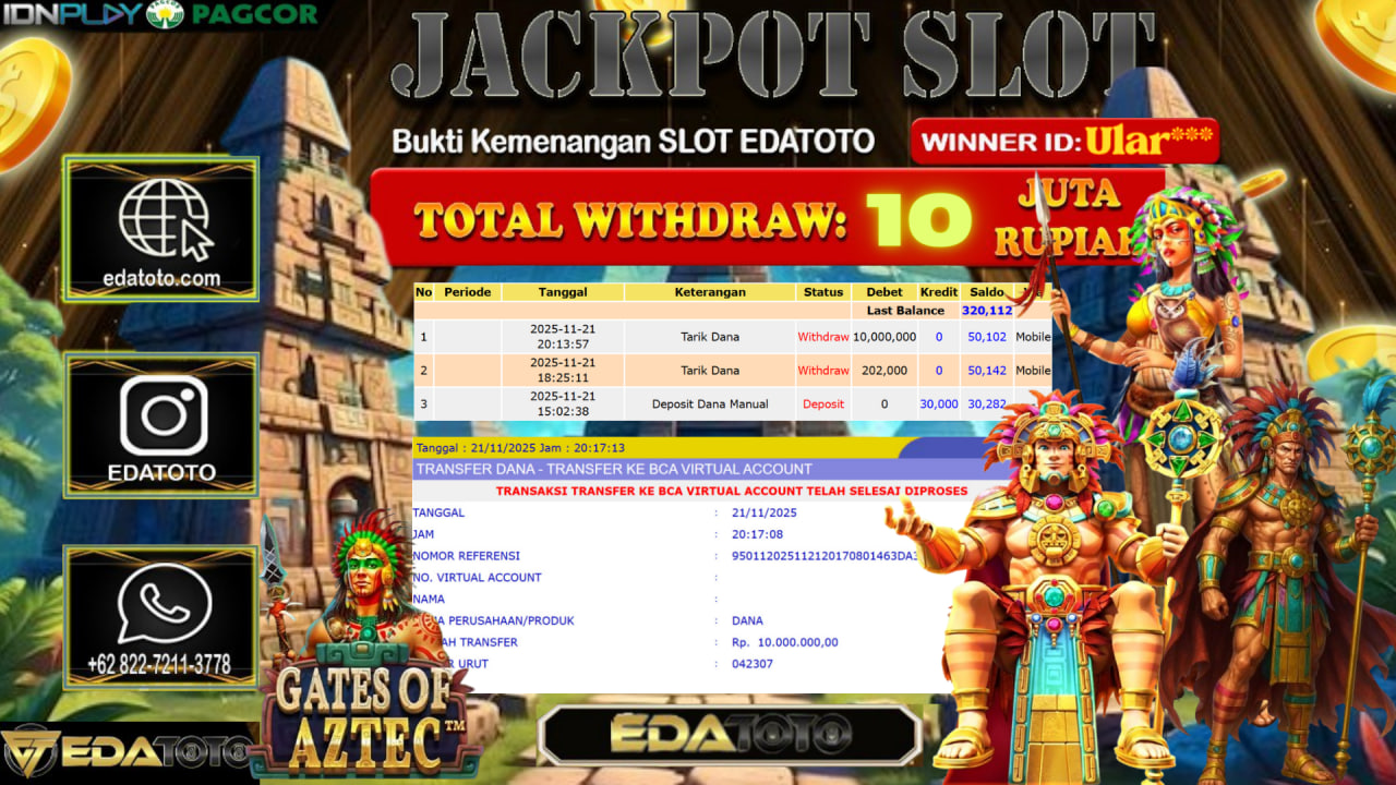 Selamat Kepada Pemilik user ID : ULAR*** Hari/Tanggal :Sabtu / 20, November 2025 Jackpot : Rp. 9,000,000 JT Withdraw :10,000,000 JT . . .