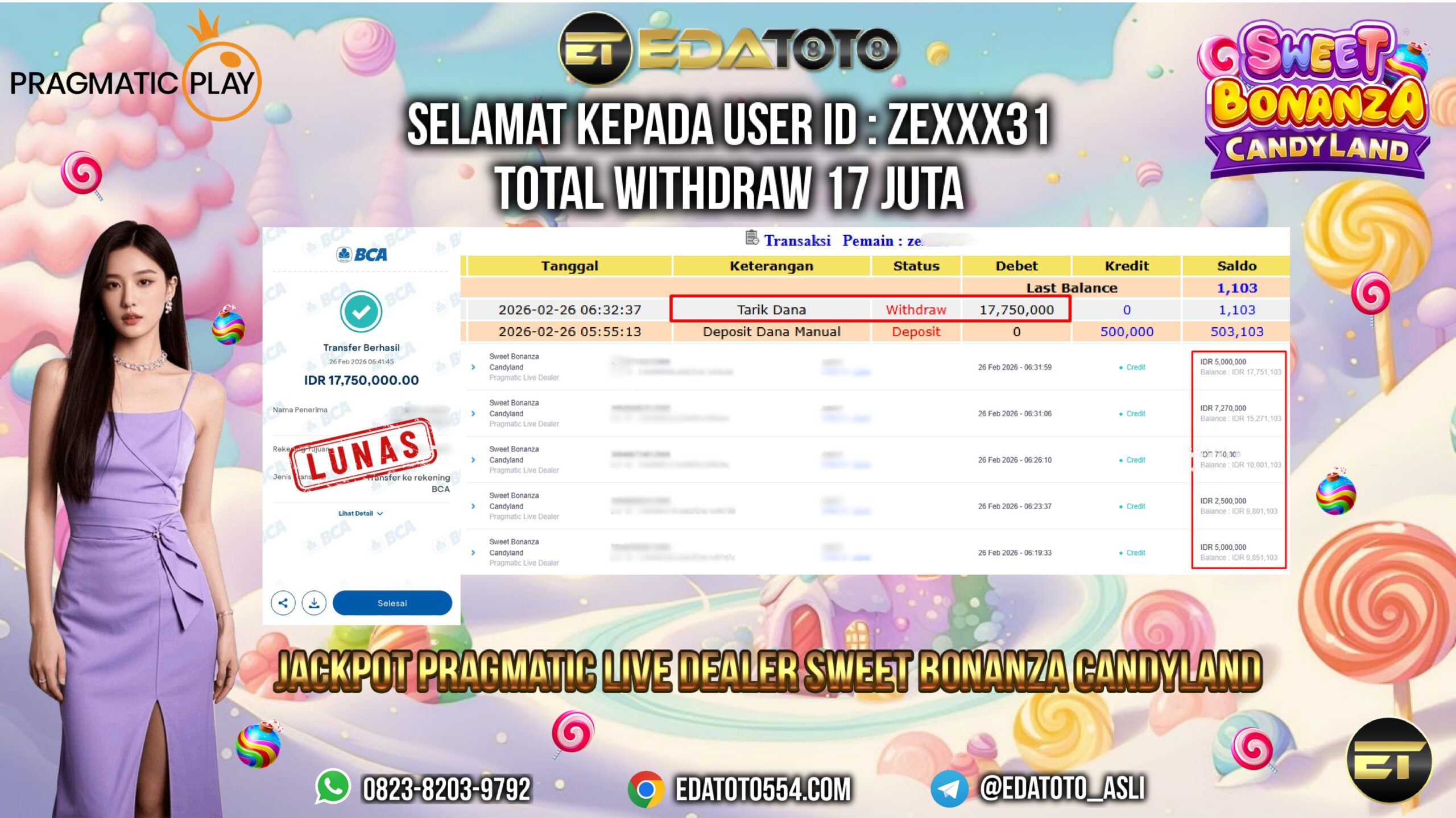 Selamat Kepada Pemilik user ID : ZE***31 Hari/Tanggal : Kamis / 26 februari 2026 Jackpot : Rp, 18,270,000 JT . . .