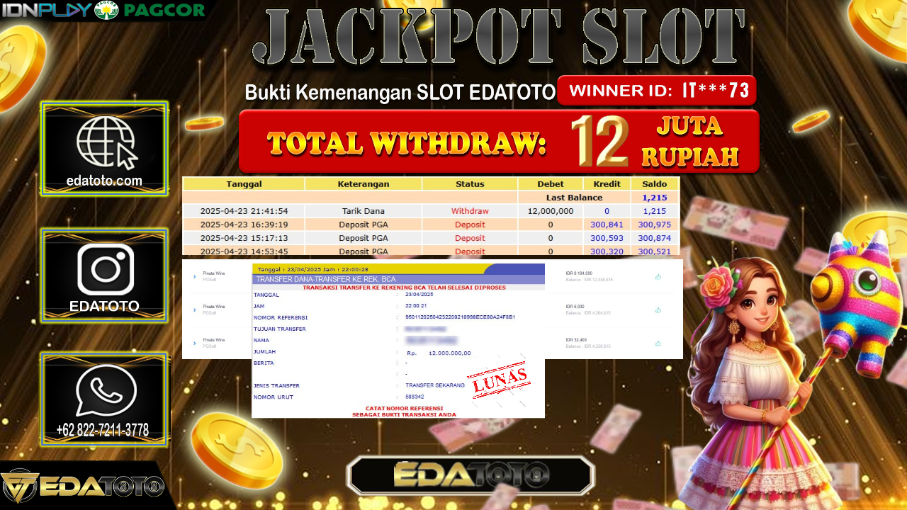 Selamat Kepada Pemilik user ID : IT***73 Hari/Tanggal : Kamis / 24 , April 2025 Jackpot : Rp. 12.000.000 JT Permainan . . .