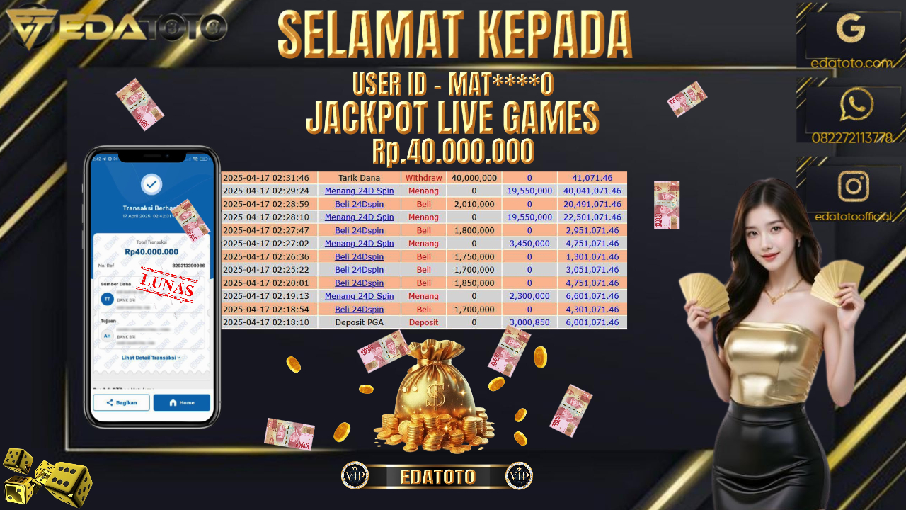 Selamat Kepada Pemilik user ID : MAT****0 Hari/Tanggal : Kamis/ 17 , April 2025 Jackpot : Rp. 40.000.000 JT Permainan . . .