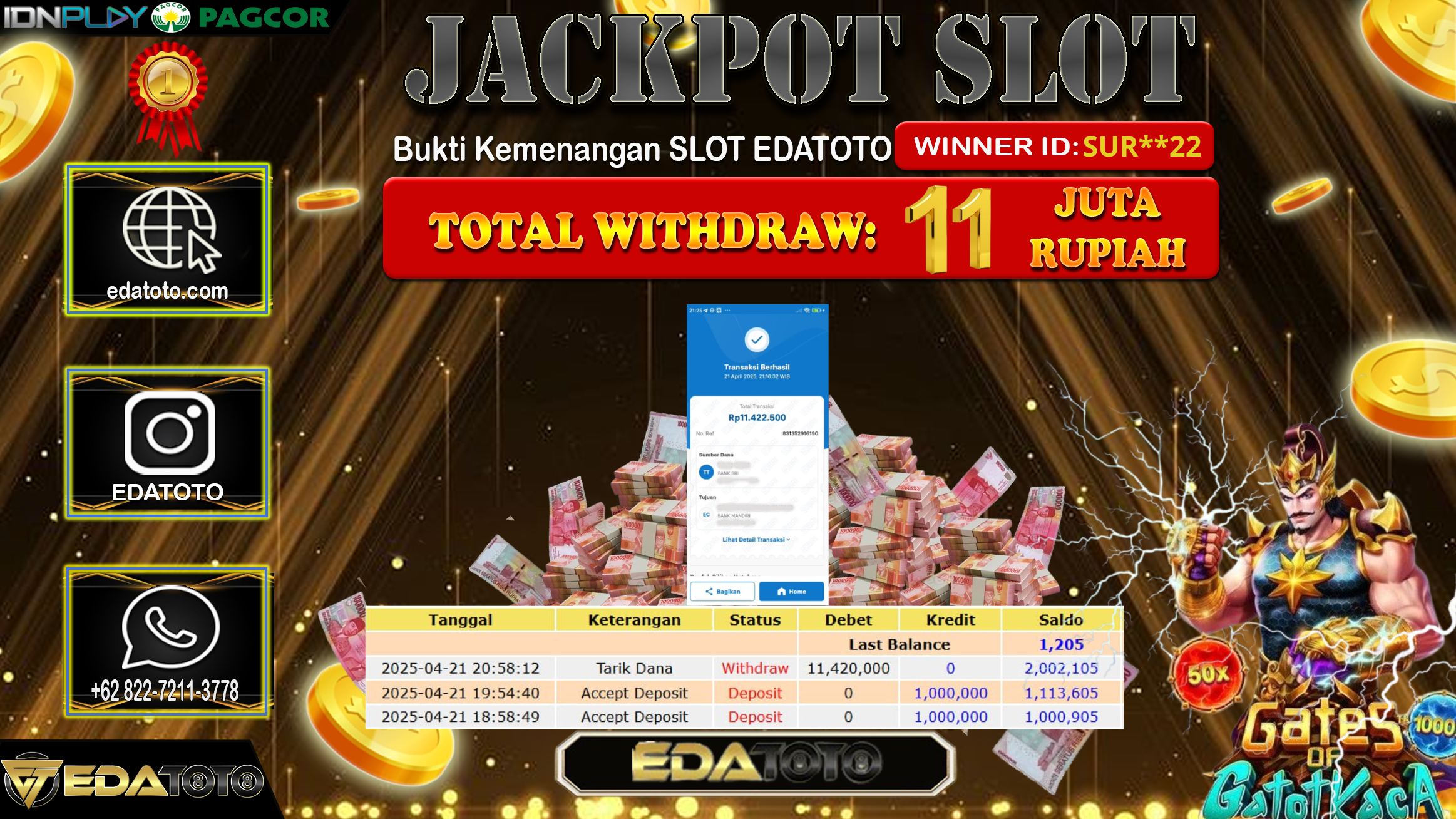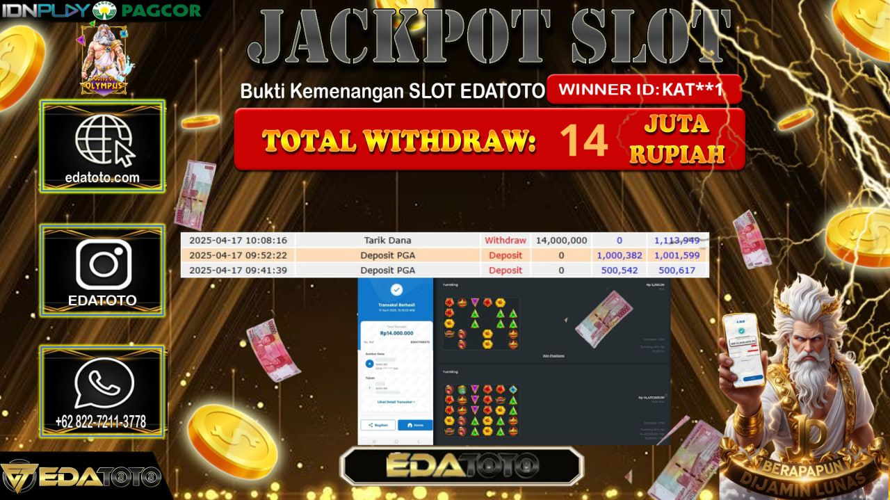 Selamat Kepada Pemilik user ID : KAT**1 Hari/Tanggal : Jumat/ 18 , April 2025 Jackpot : Rp. 14.000.000 JT Permainan . . .