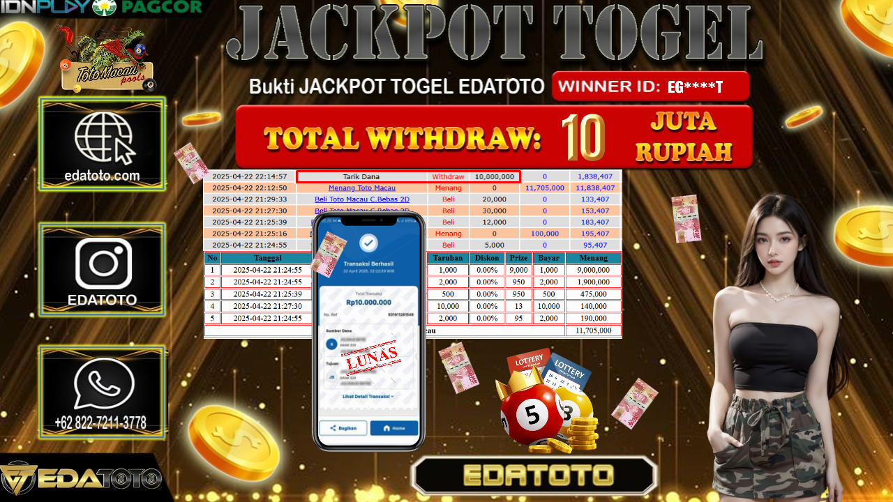Selamat Kepada Pemilik user ID : EG****T Hari/Tanggal : Rabu/ 23 , April 2025 Jackpot : Rp. 10.000.000 JT Permainan : . . .