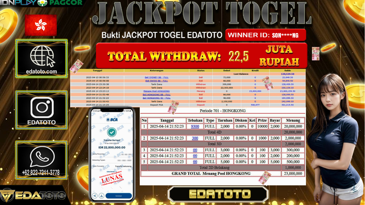 Selamat Kepada Pemilik user ID : SON****NG Hari/Tanggal : Selasa / 15 , April 2025 Jackpot : Rp. 22.500.000 JT . . .