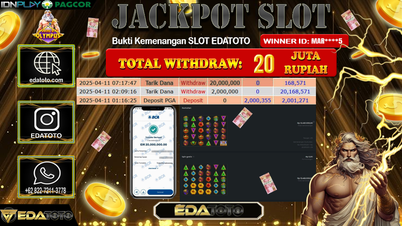 Selamat Kepada Pemilik user ID : MAR****5 Hari/Tanggal : Sabtu / 12 , April 2025 Jackpot : Rp. 20.000.000 JT . . .