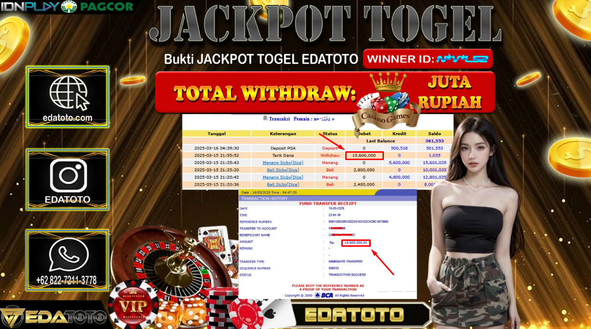 Selamat Kepada Pemilik user ID : n*v*l52 Hari/Tanggal : Sabtu / 15 , MARET 2025 Jackpot : Rp. 15.600.000 JT Permainan . . .