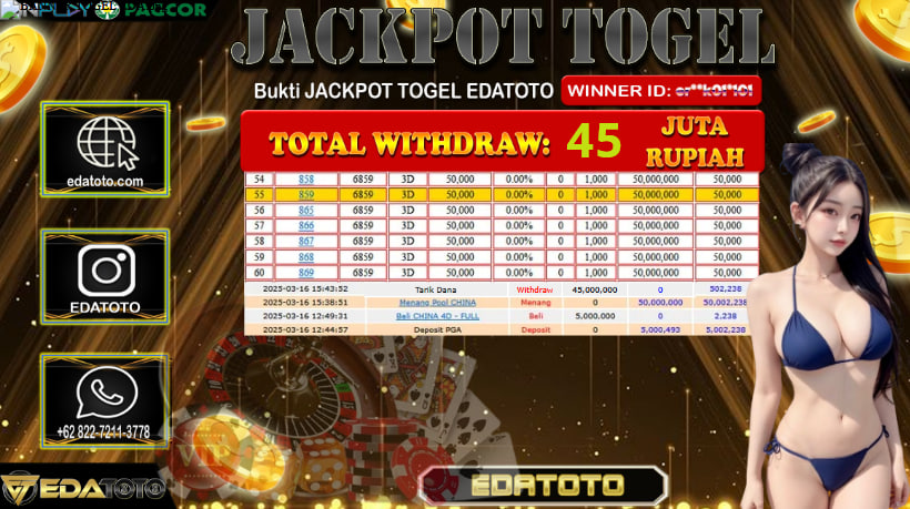 Selamat Kepada Pemilik user ID : er**k01*101 Hari/Tanggal : Minggu / 16 , MARET 2025 Jackpot : Rp. 45.000.000 JT . . .