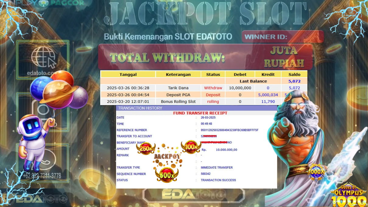Selamat Kepada Pemilik user ID : z*m*ud Hari/Tanggal : Sabtu / 26 , MARET 2025 Jackpot : Rp. 10.000.000 JT . . .