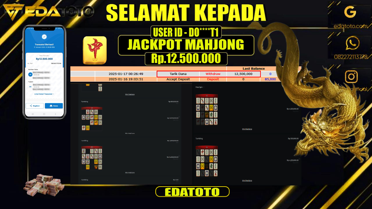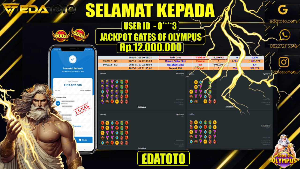 Selamat Kepada Pemilik user ID : DO****T1 Hari/Tanggal : JUMAT / 17 , JANUARY 2025 Jackpot : Rp. 12.500.000 . . .