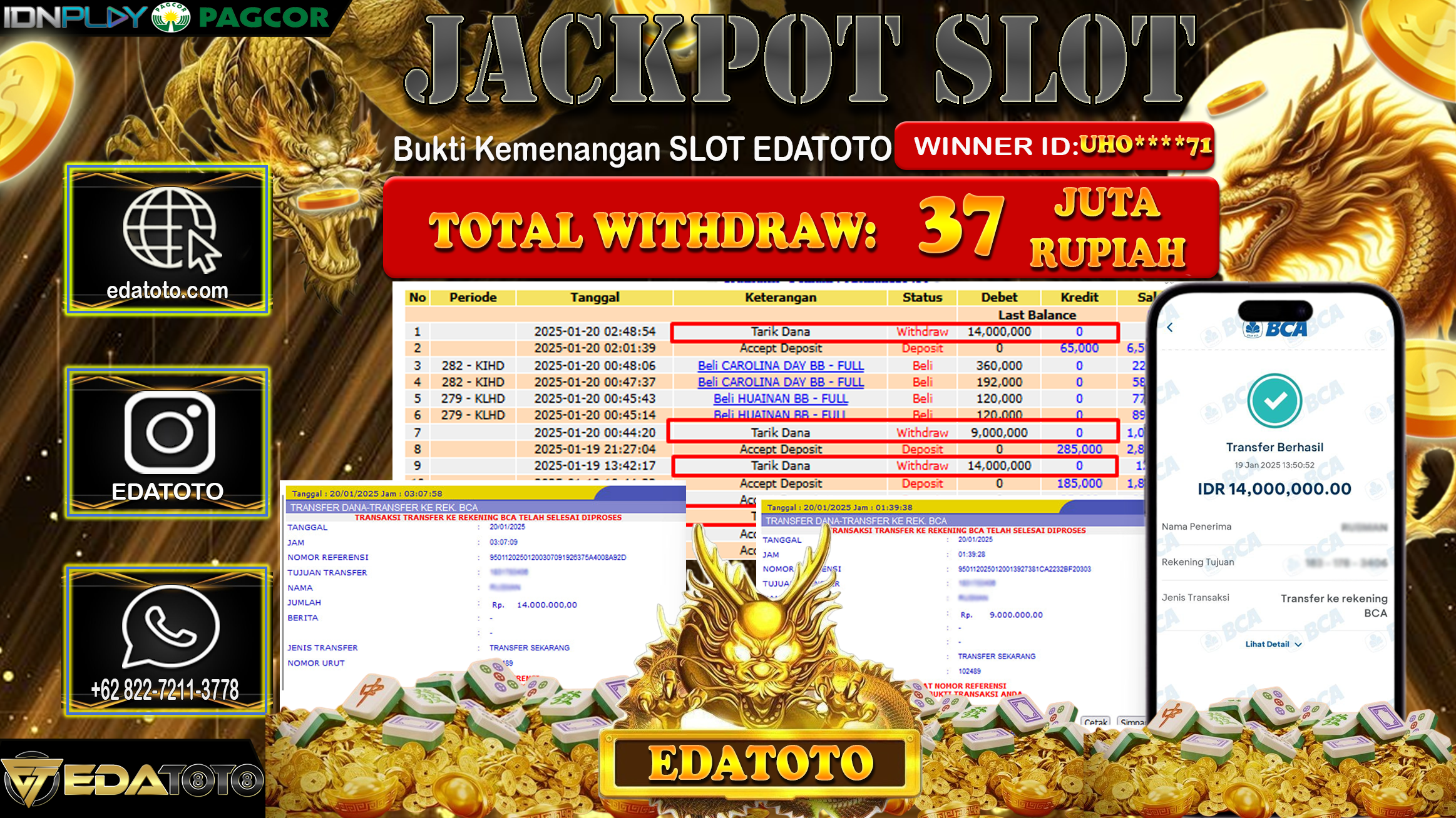 Selamat Kepada Pemilik user ID : UHO****71 Hari/Tanggal : selasa/ 21 , JANUARY 2025 Jackpot : Rp. 37.000.000 JT Permainan . . .