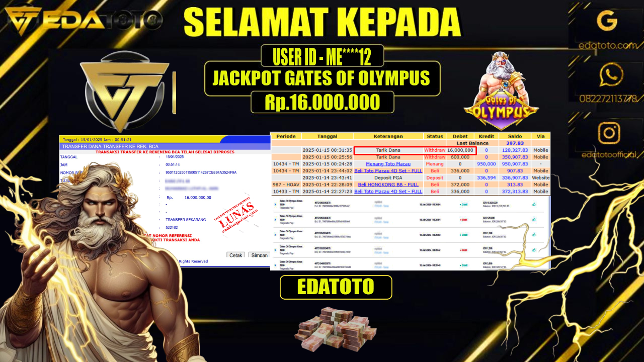 Selamat Kepada Pemilik user ID : ME****12 Hari/Tanggal : KAMIS / 16 , JANUARY 2025 Jackpot : Rp. . . .