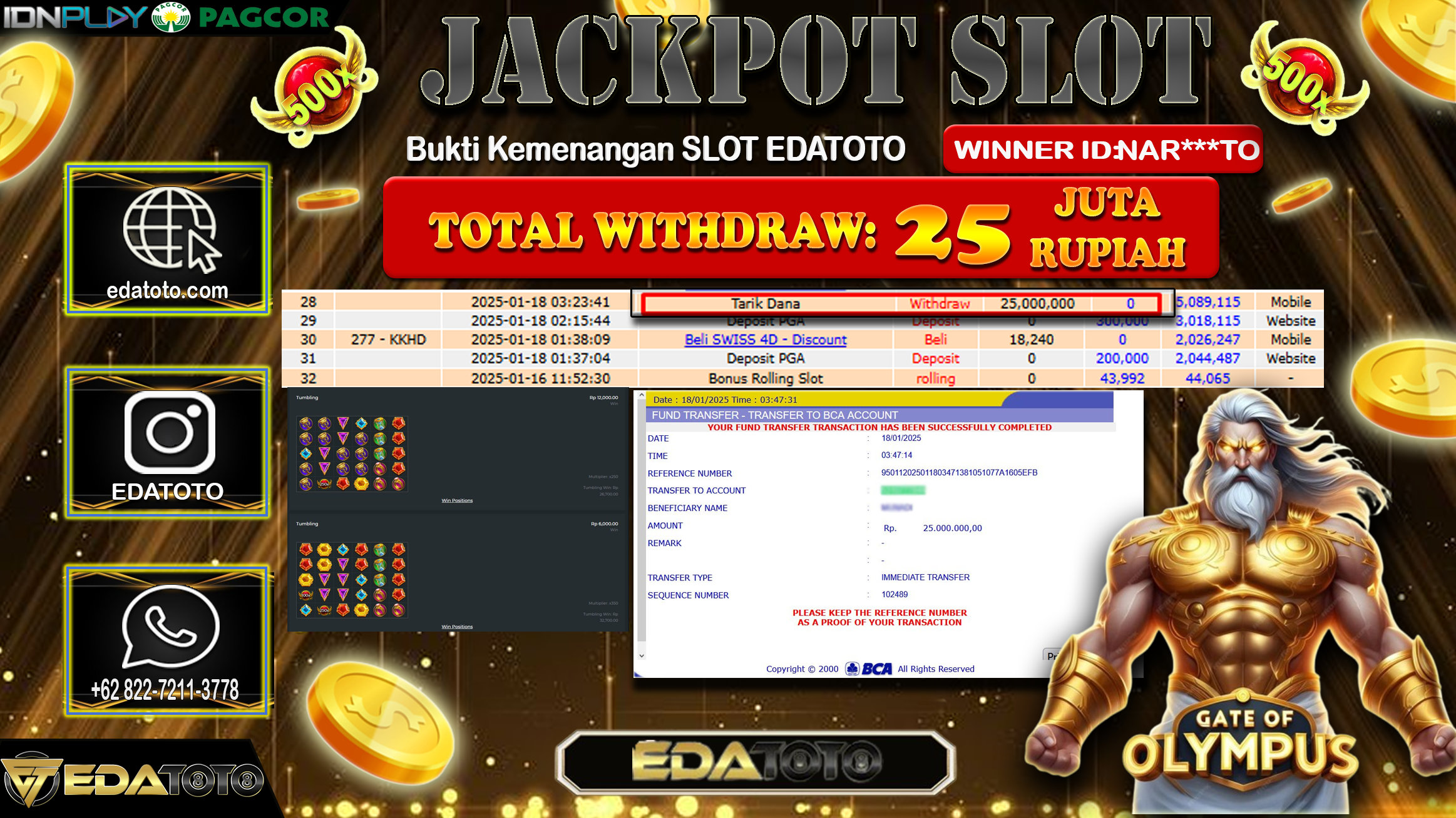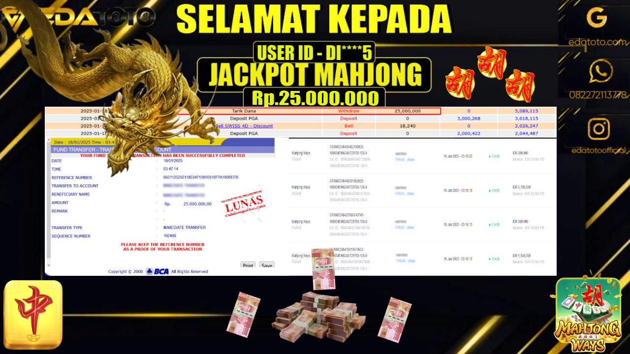 Selamat Kepada Pemilik user ID : NAR***TO Hari/Tanggal : SENIN / 20 , JANUARY 2025 Jackpot : Rp. 25.000.000 JT . . .