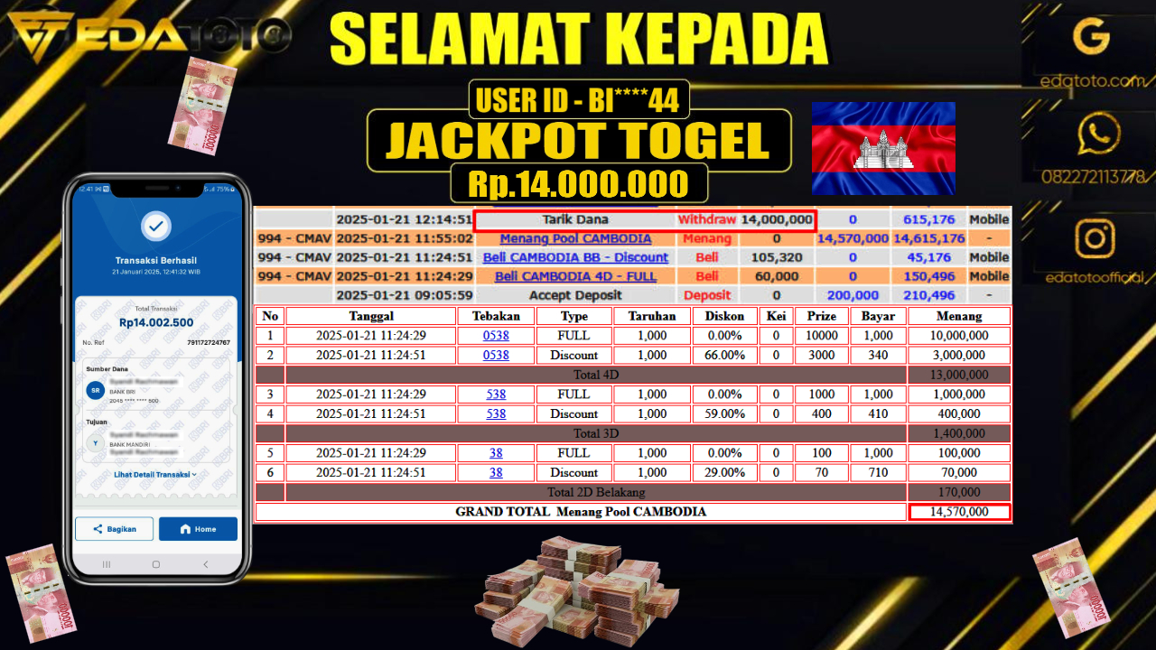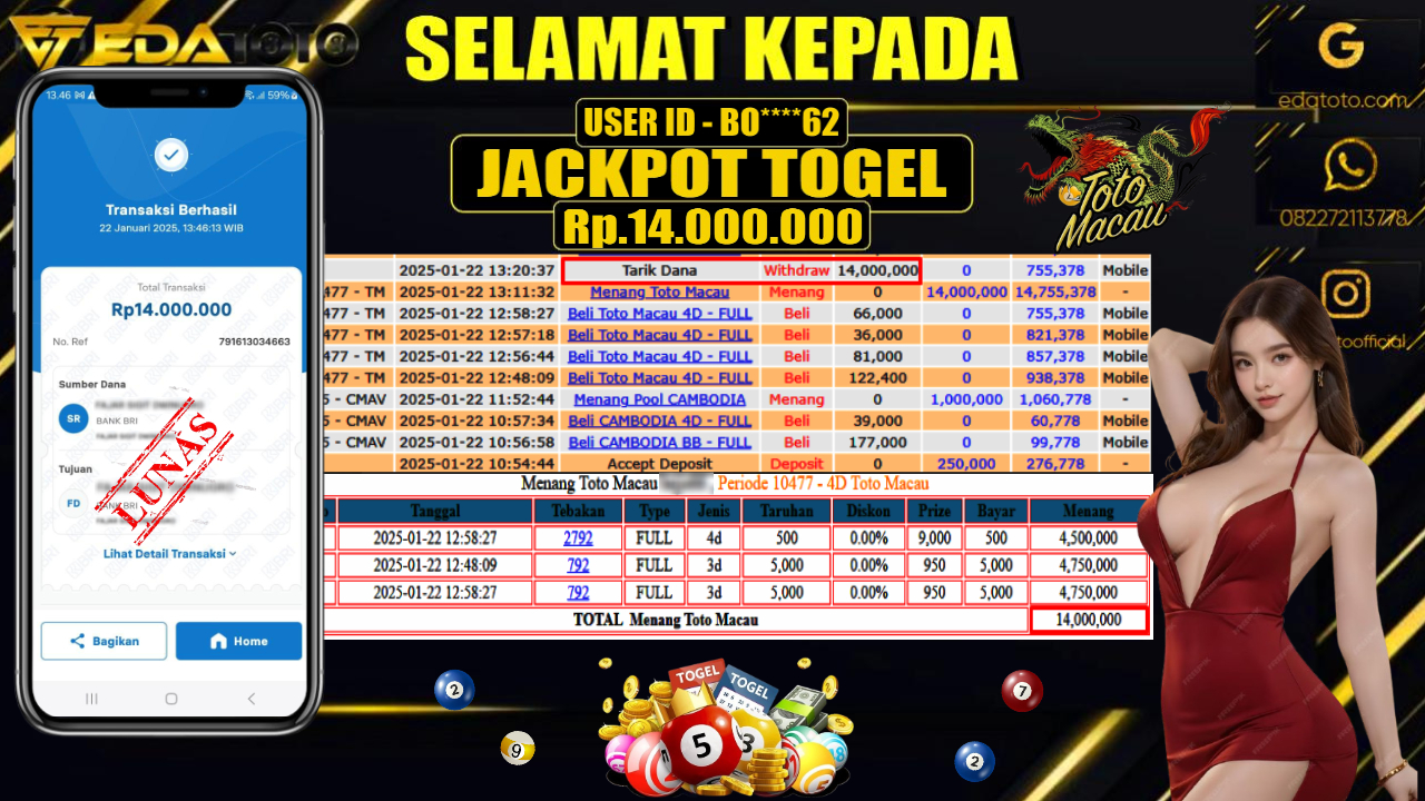 Selamat Kepada Pemilik user ID : BI****44 Hari/Tanggal : Rabu / 22 , JANUARY 2025 Jackpot : Rp. 14.000.000 JT . . .