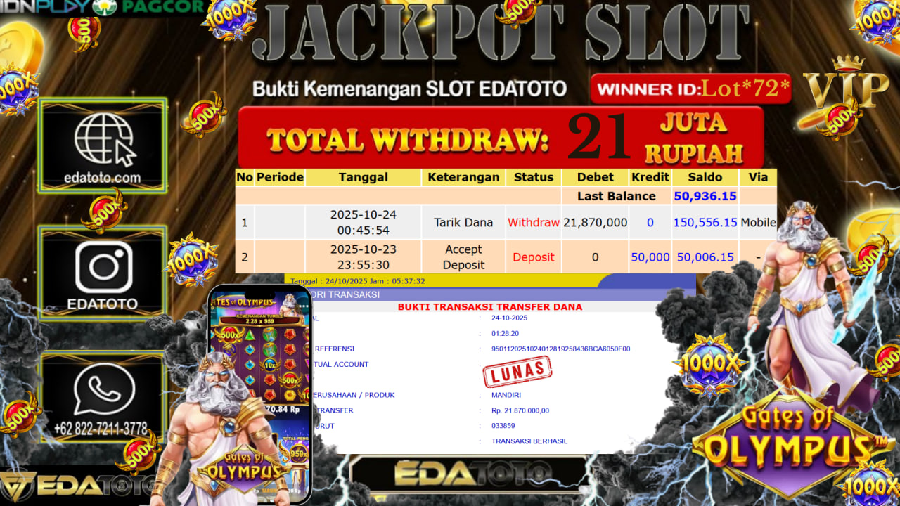 Selamat Kepada Pemilik user ID : Lot*72* Hari/Tanggal : Jumat / 24, Oktober 2025 Jackpot : Rp. 21.870.000 JT Permainan . . .