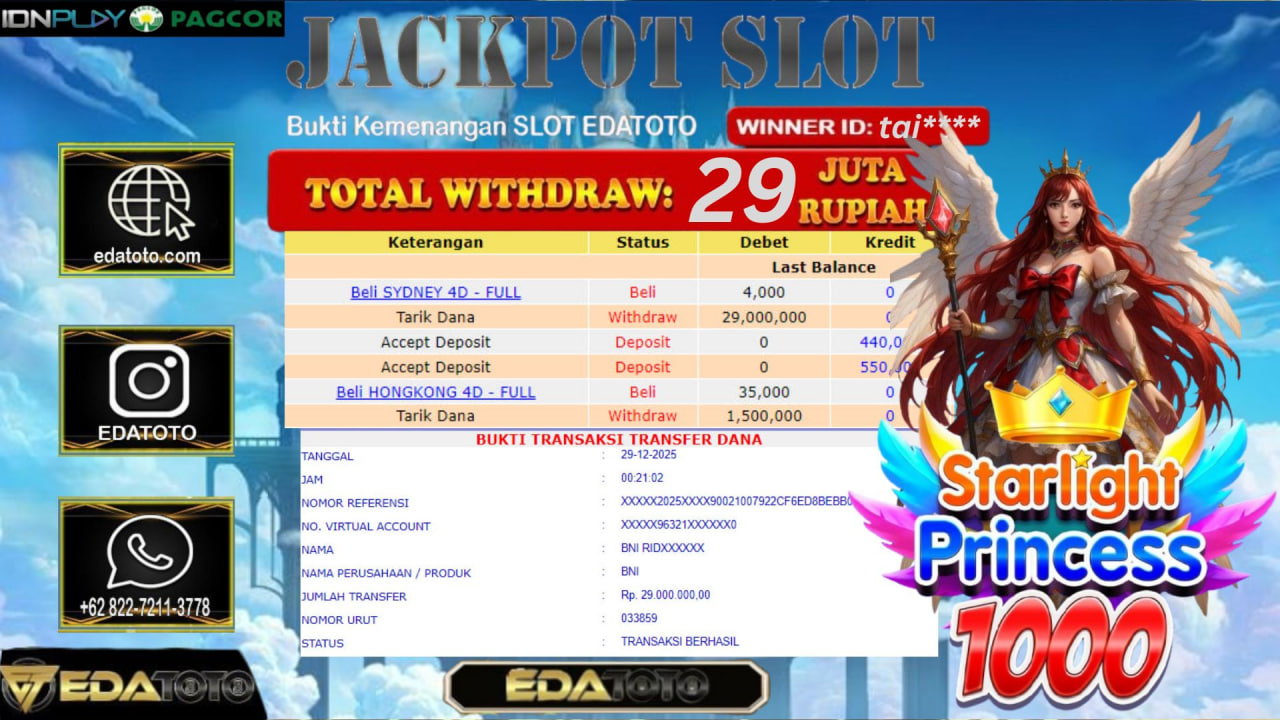 Selamat Kepada Pemilik user ID :tai**** Hari/Tanggal :kamis/ 28, Desember 2025 Jackpot : Rp. 29,000,000 JT Withdraw : 29,000,000 JT . . .