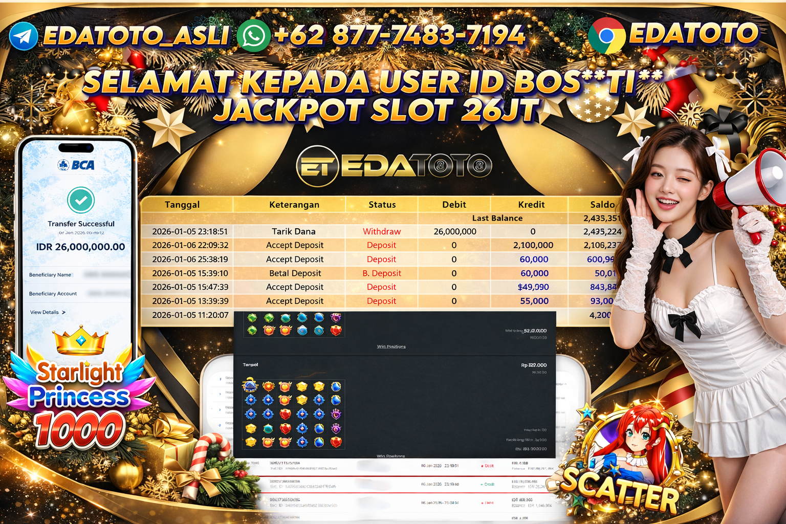 Selamat Kepada Pemilik user ID : BOS**TI** Hari/Tanggal :kamis/ 6, Januari 2026 Jackpot : Rp. 26,000,000 JT Withdraw : 26,000,000 . . .