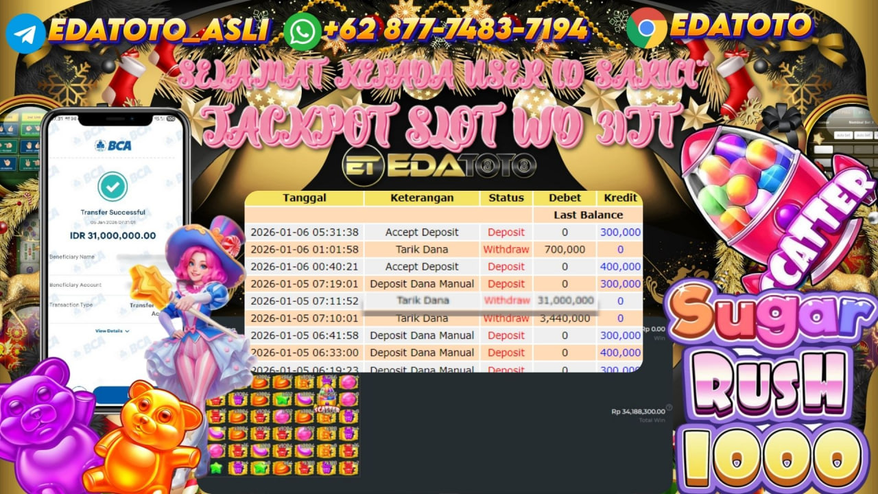 Selamat Kepada Pemilik user ID : SARICI** Hari/Tanggal :kamis/ 5, Januari 2026 Jackpot : Rp. 31,000,000 JT Withdraw : 31,000,000 . . .